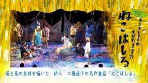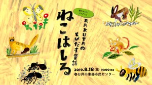 親子わくわくプログラム KAKUTAのとびだす童話 ねこはしる 会場 春日井市東部市民センター 開催日 2019年8月18日(日)14:00~ 入場料 おとな¥3,000(PiPi会員¥2,700)、こども(小~高校生)¥500 ※税込、全席指定、当日券同額、未就学児入場不可 主催・問合せ かすがい市民文化財団 0568-85-6868 [企画制作]KAKUTA …………………………………………………………………………………… そうなんだ きみとおれ いっしょに風の音をきく いっしょに笑い、はしる! いのちまたたく感動の物語を、ことばにのせ、美しい音楽にのせ、 あそびごころいっぱいでお届けする「とびだす童話」。 劇場が「のはら」になって、猫が、魚が、アリやチョウチョが… たくさんのいのちが、舞台の上をかけまわる! こどものあなたへ、これからおとなになるあなたへ、 いのちを産んだあなたにこそ見て欲しい、いのちのメッセージ。 《ものがたり》 のろまでドジだけど気持ちの優しい子猫のラン。 池の魚と仲よしになって、いつしか二人は心を通わせ、 ともに成長します。 ところがある日、魚は他の兄弟猫たちに見つかり、 魚とり競争がおこなわれることに。 ランが悩んだ末、こころに誓った哀しくもたくましい決意とは… …………………………………………………………………………………… 作 : 工藤直子 構成・脚色・演出 : 桑原裕子 音楽 : 扇谷研人 出演 : 成清正紀、異儀田夏葉、四浦麻希、多田香織、酒井晴江、置田浩紳、森崎健康、吉田紗也美、織詠、高橋 乱、矢田未来、細村雄志、桑原裕子、添野 豪(ペテカン) うた : 花れん [STAFF] 舞台美術 : 田中敏恵 舞台監督 : 安田美知子 照明 : 宮野和夫 音響 : 島貫 聡 振付 : 浅野康之 衣裳 : 石川俊一 舞台写真 : 伊藤華織 宣伝イラスト : 楓 真知子 宣伝美術 : 秋澤一彰 …………………………………………………………………………………… [助成]一般財団法人地域創造、 文化庁文化芸術振興費補助金(劇場・音楽堂等機能強化推進事業)独立行政法人日本芸術文化振興会 [協賛]サンマルシェ - かすがい市民文化財団HP より 引用